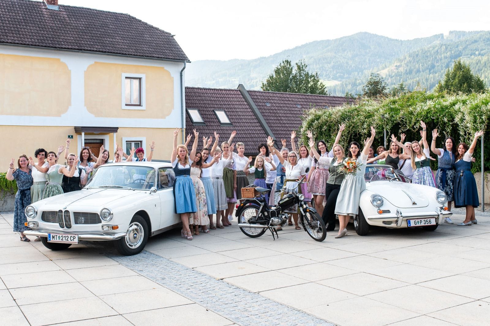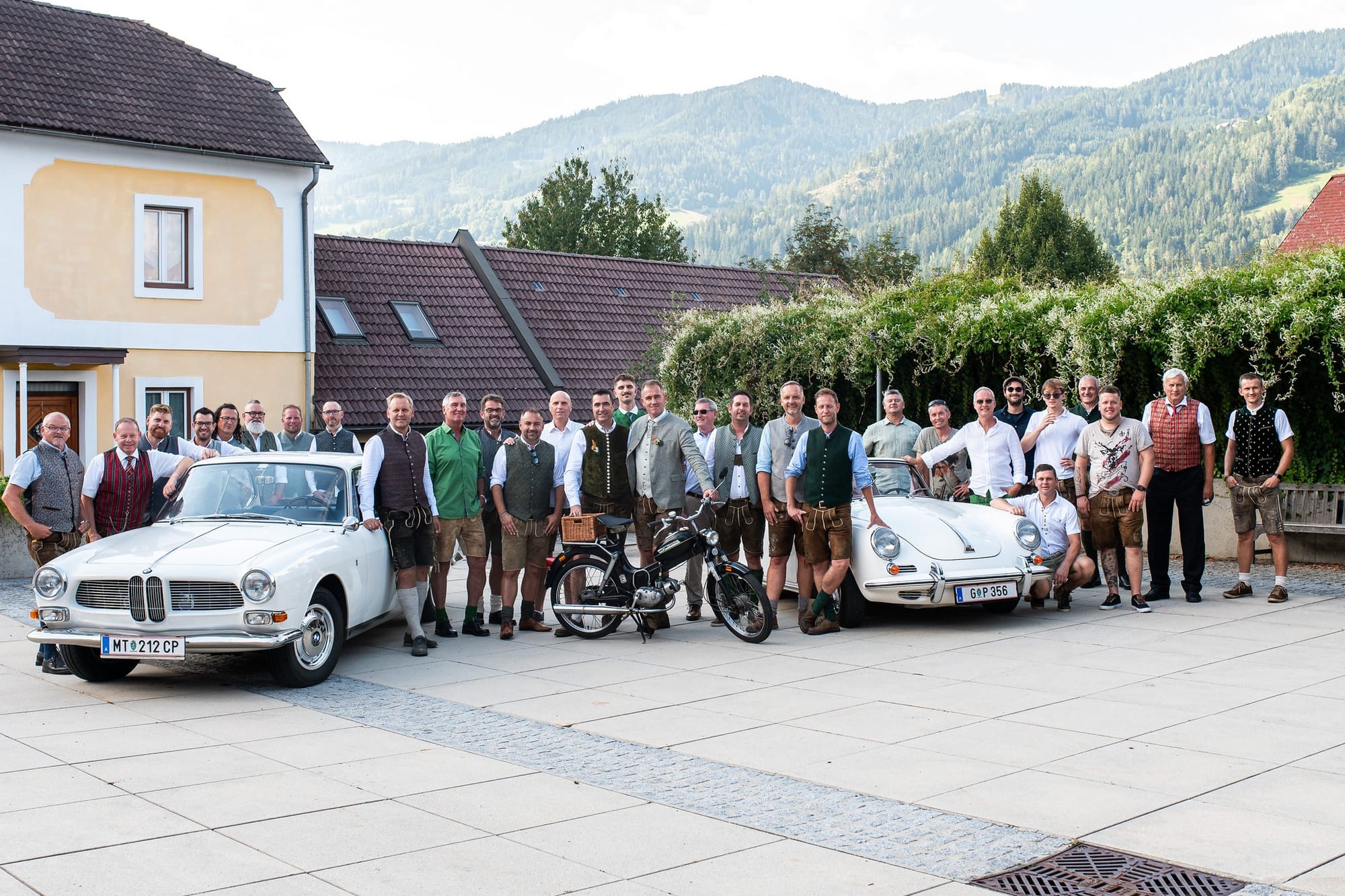 Zusammen mit einem Porsche 356 SC Cabrio und einer Puch MV50 sorgte Berti für einen stilvollen Auftritt des Brautpaares und eine dementsprechende Kulisse während der Hochzeitsfeier.